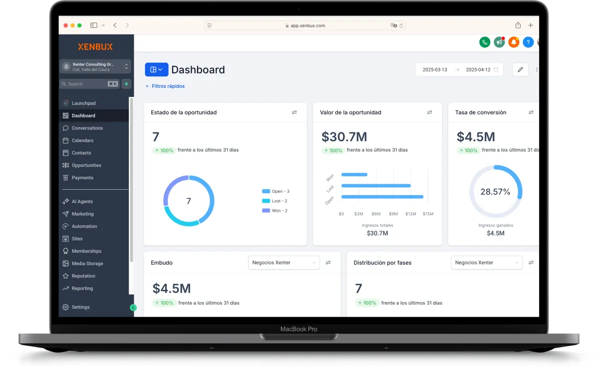 Xenbux te ayuda a captar más clientes potenciales con herramientas intuitivas y automatizadas. Diseña sitios web, embudos y landing pages de alto impacto, captura leads con formularios inteligentes y permite que tus clientes agenden citas fácilmente, todo desde una sola plataforma.